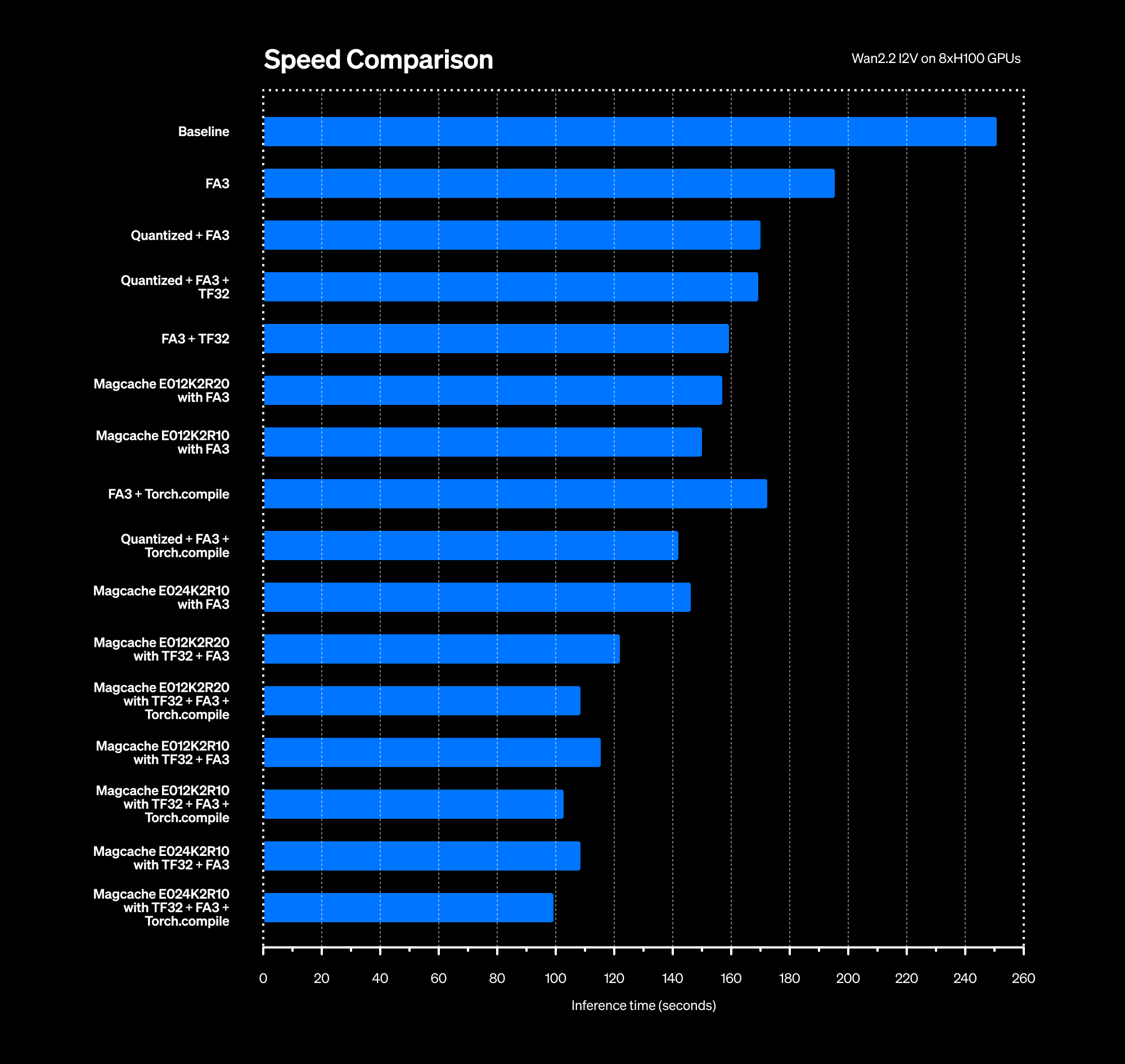 We have developed a complete suite to test all these combinations, which can be applied one by one or simultaneously together to achieve the fastest inference speed for Wan2.2 I2V tasks.