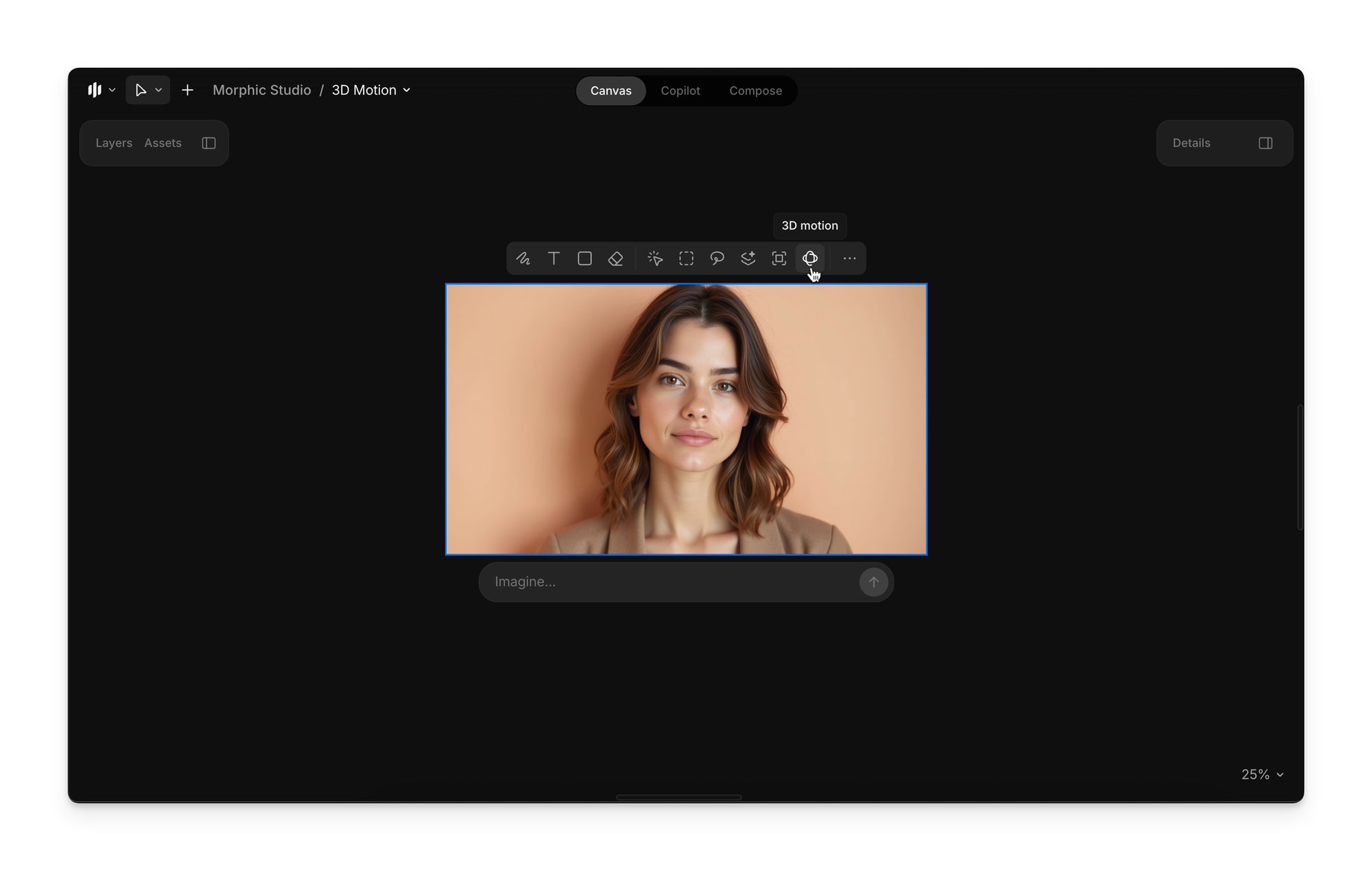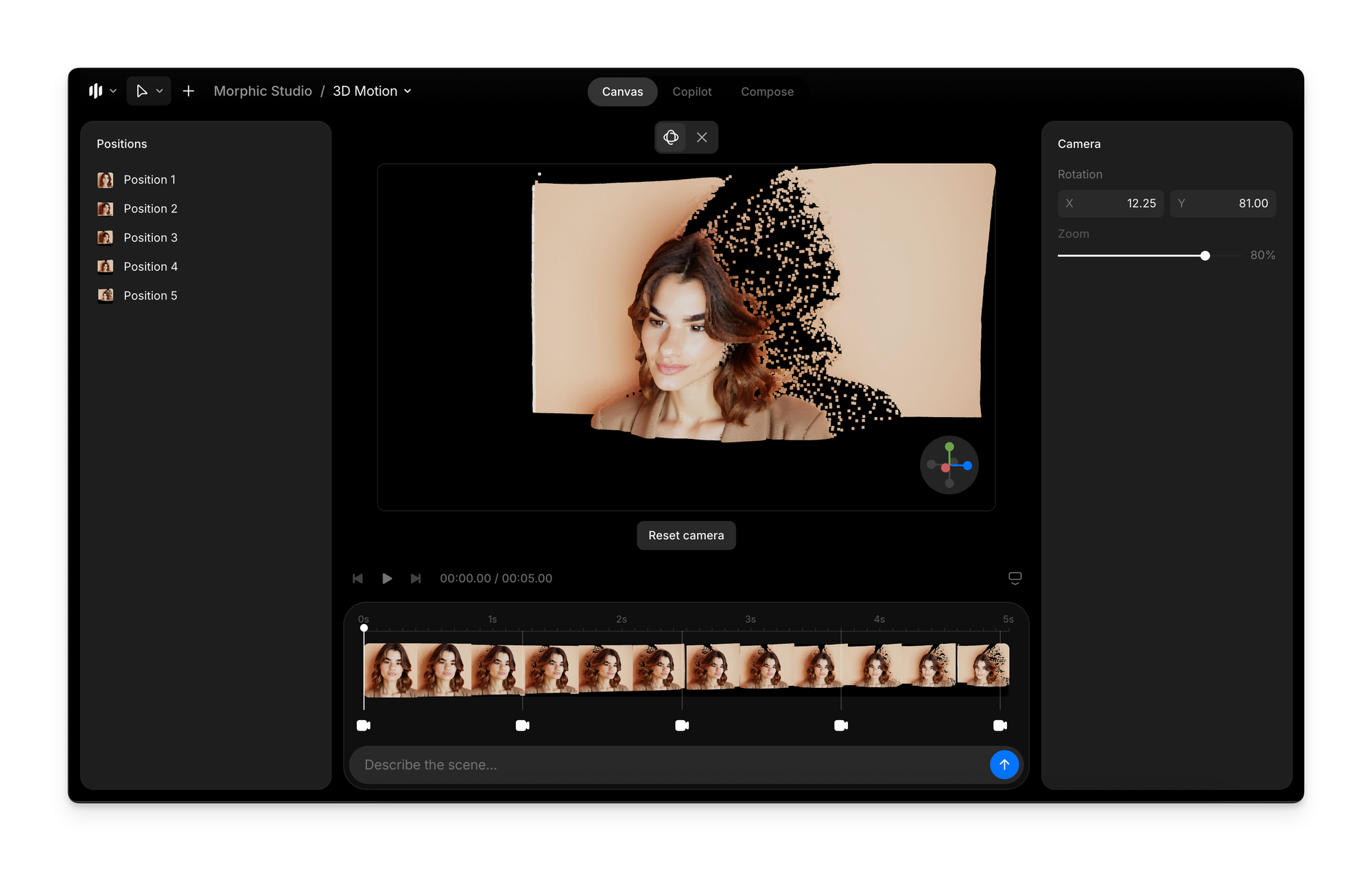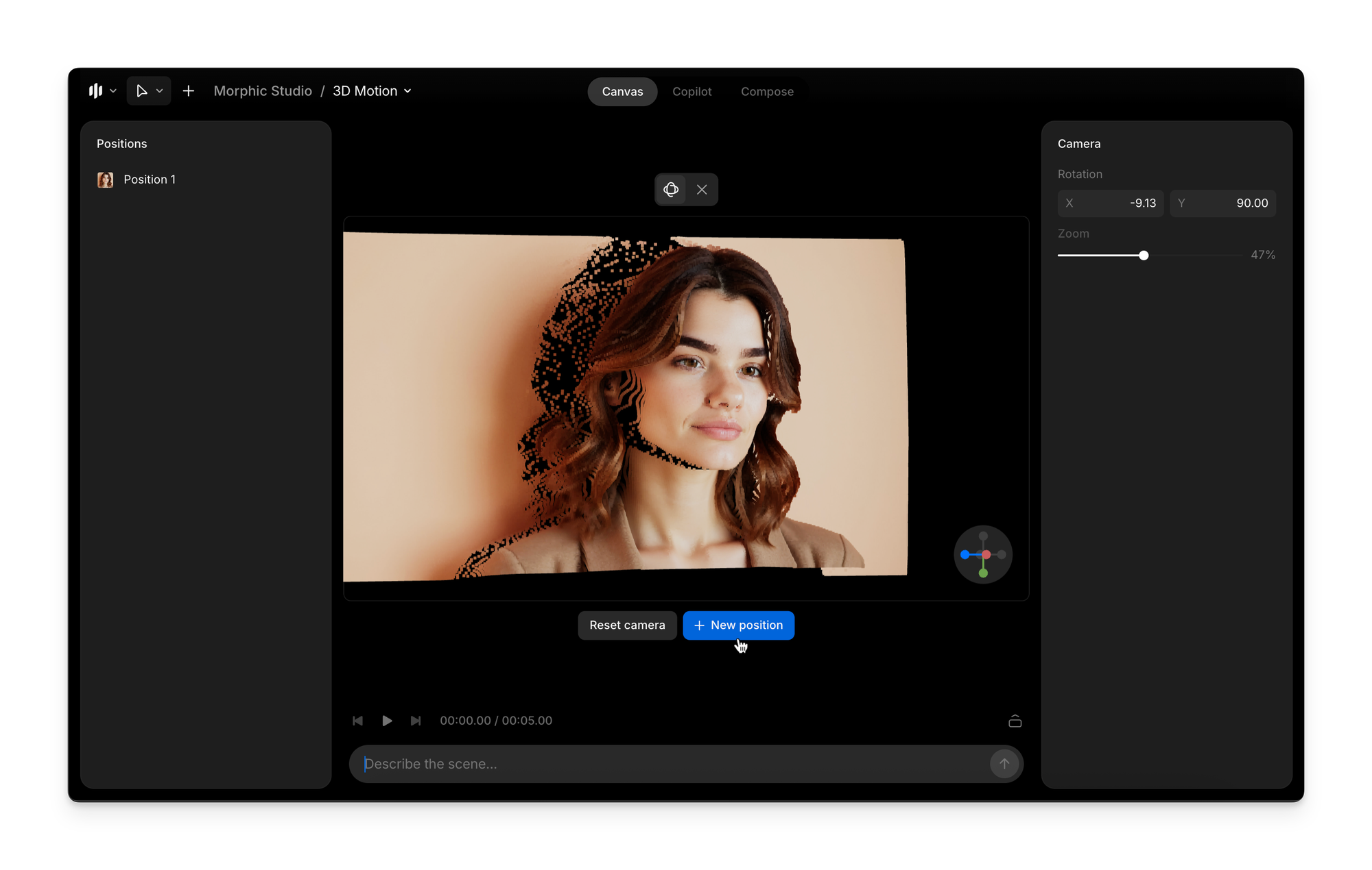 Once you toggle on 3D Motion, Morphic transforms your image into a point cloud, detecting depth and layering the scene. You can then explore the space, choose your own camera positions, and create a custom motion path right from your browser. Define your camera path, add depth, and watch it come to life.